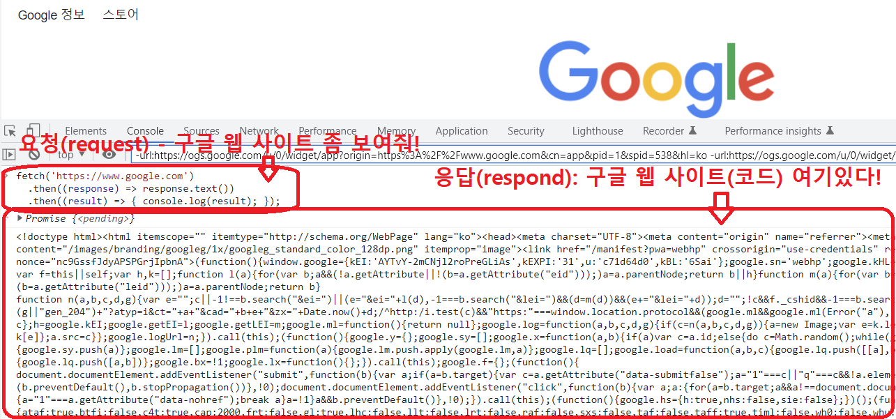 fetch 함수를 통해 구글 웹사이트 좀 보여줘!라고 요청을 보내면 응답이 온다.